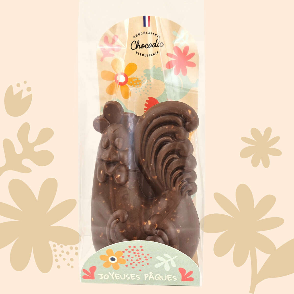 Ce coq en chocolat incarne l’excellence de l’artisanat chocolatier. La combinaison du chocolat au lait fondant et des noisettes caramélisées crée une expérience sensorielle unique. Chaque bouchée est un moment de plaisir intense, à savourer seul ou en famille. Gaston Le Coq reflète le savoir-faire et la passion des chocolatiers Chocodic, offrant un produit authentique et raffiné qui sublime les célébrations de Pâques.