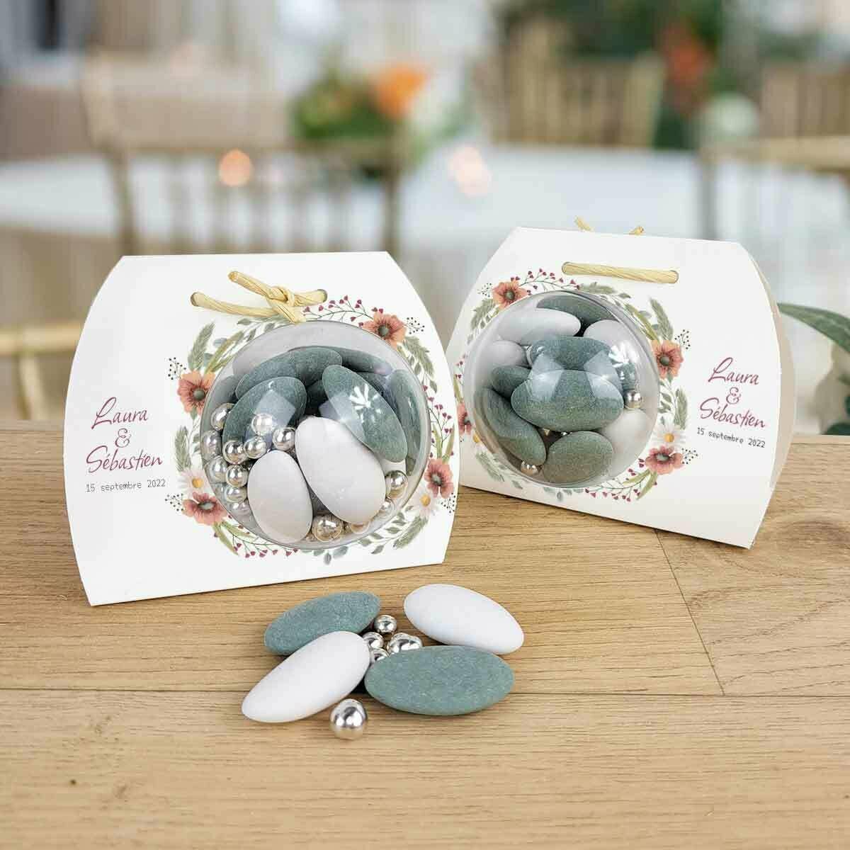 Boite à dragées boule ''Couronne de fleurs'' personnalisée