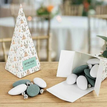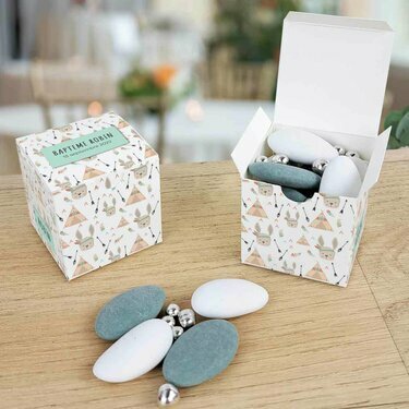 Une naissance ou un baptême à célébrer ? Optez pour les contenants à dragées sur le thème Indiens ! Illustrés par des tipis, des flèches, des plumes et des lapins indiens, ce thème est idéal pour les évènements dédiés aux enfants. De couleurs neutres contrasté par le bleu, ce thème pourrait s’accompagner de dragées de couleurs terracotta ou neutres. Ce thème doux est un excellent choix pour fêter une naissance ou un baptême et les contenants feront de parfaits cadeaux souvenirs pour se remémorer ce moment unique !