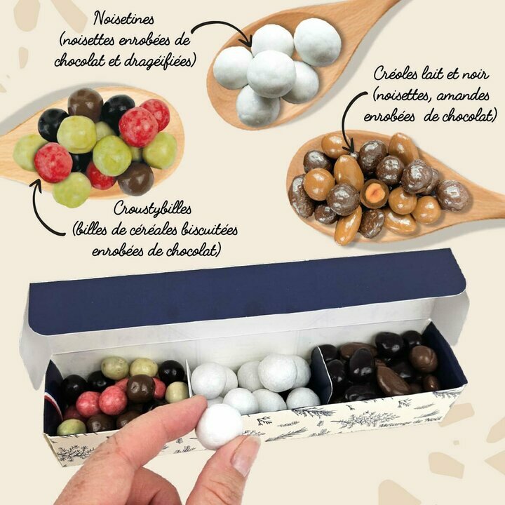 - Créole : AMANDE, NOISETTES, Chocolat au LAIT (Sucre, beurre de cacao, poudre de LAIT entier, masse de cacao, émulsifiant : lécithine de SOJA, arôme naturel de vanille), Chocolat noir (Masse de cacao, sucre, beurre de cacao, émulsifiant : lécithine de SOJA, arôme naturel de vanille), Eau, Sirop de glucose déshydraté, Gomme arabique, Huile de pépins de raisin raffinée, Émulsifiant : lécithine de SOJA. Noisetine : Chocolat noir (pâte et beurre de cacao, sucre, émulsifiant: lécithine de Soja), sucre, NOISETTE, gomme d'acacia, amidon de riz, sirop de glucose, agents d'enrobage: E901, E903, arôme. Croustybilles : Chocolat blanc (Sucre, beurre de cacao, LAIT entier en poudre, émulsifiant : lécithine de SOJA, arôme naturel de vanille), Céréales croustillantes (Farine de BLÉ, sucre, farine de BLÉ malté, amidon de BLÉ, extrait de malt d'ORGE, poudre de LAIT écrémé, sel), Eau, Sirop de glucose déshydraté, Gomme arabique, Colorants alimentaires (Concentré de spiruline, carthame, citron, radis, cassis et pomme), Huile de pépins de raisin raffinée, Émulsifiant : lécithine de SOJA.