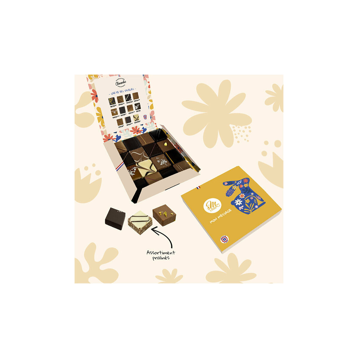 Vous souhaitez intégrer votre charte graphique sur le coffret ou avez besoin de conseils ? Notre équipe commerciale est à votre écoute au 02 51 36 14 14 ou par e-mail à direction@chocodic.com.