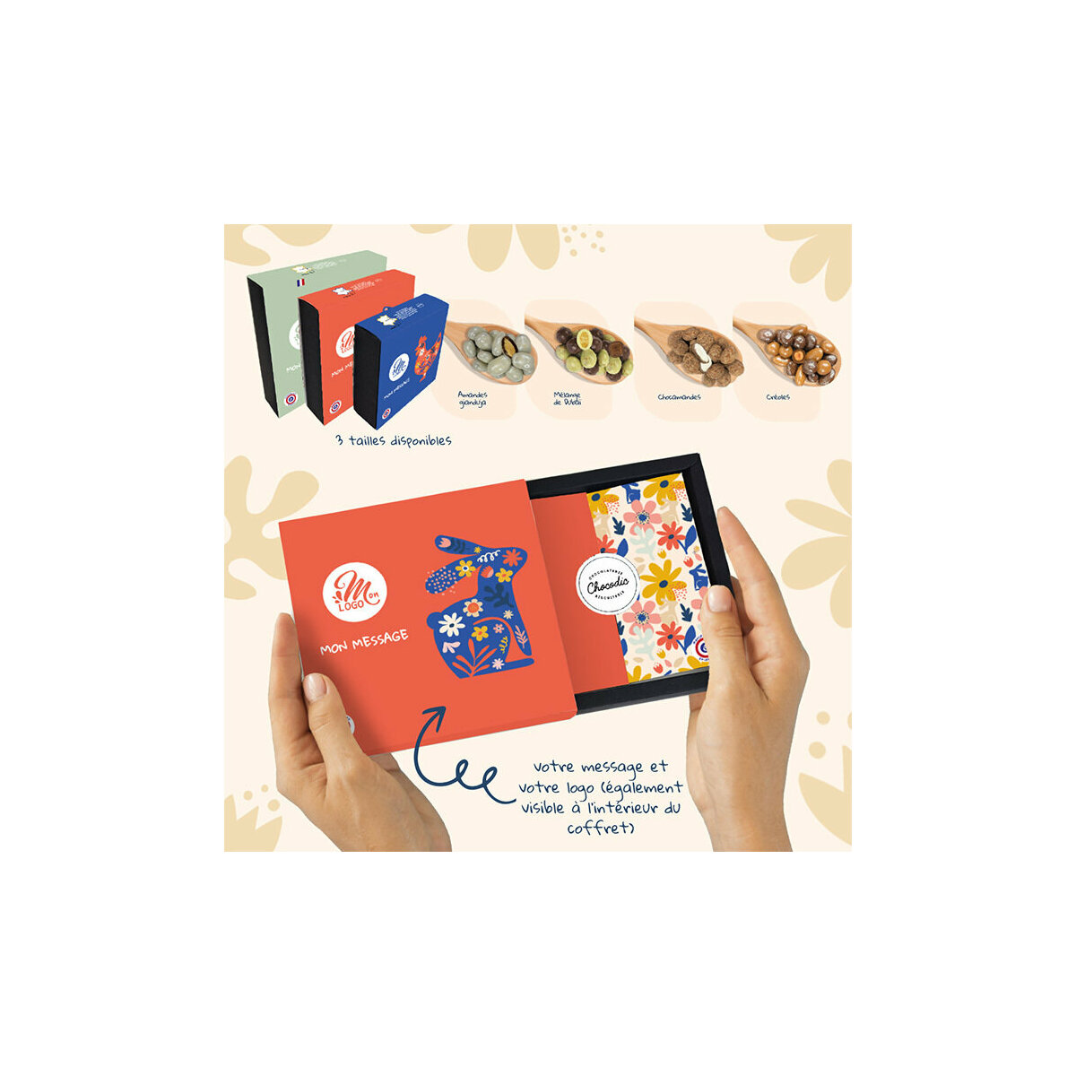 Ce coffret est entièrement personnalisable avec votre logo et votre message d’entreprise, transformant le cadeau gourmand en un outil de communication unique. La personnalisation permet de renforcer votre image de marque tout en offrant une attention raffinée et festive. C’est une manière élégante de transmettre vos vœux de Pâques et de marquer les esprits de vos clients et collaborateurs.