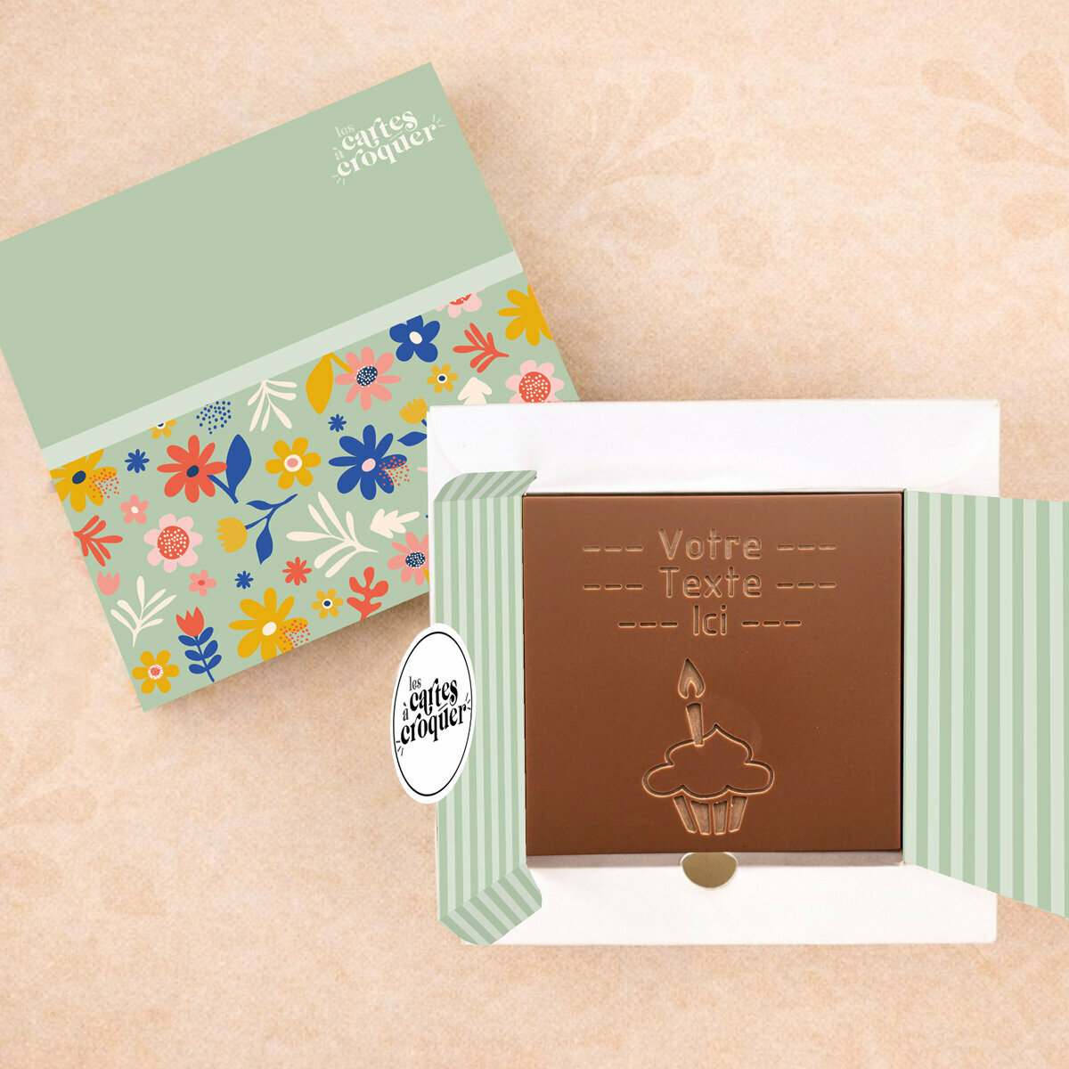 La Carte à Croquer – Modèle Cupcake est le cadeau idéal pour célébrer un anniversaire avec gourmandise et originalité. Son design festif, illustré par un cupcake décoré, apporte une touche de joie et de fête à vos vœux. Disponible en chocolat noir, lait ou lait-caramel, cette carte allie esthétisme et plaisir gustatif. Offrir cette carte, c’est transformer un simple message en un souvenir délicieux et mémorable pour petits et grands.