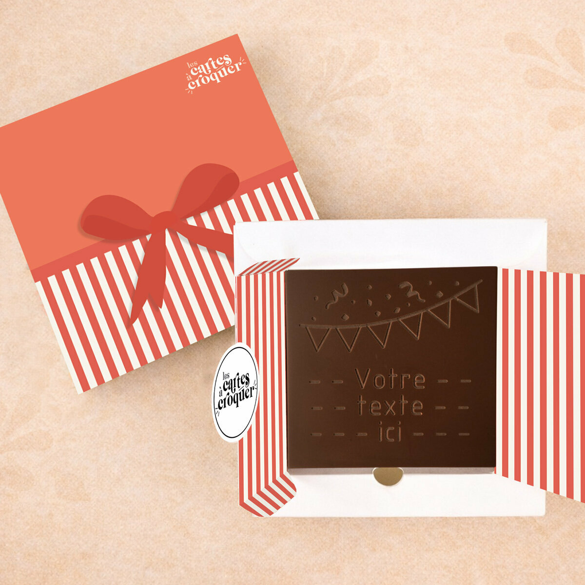 La Carte à Croquer – Modèle Fanions et Cotillons célèbre anniversaires et fêtes avec gourmandise et joie. Gravure de fanions et cotillons et personnalisation sur 3 lignes de 15 caractères dans du chocolat noir, lait ou lait-caramel. Artisanale et unique, elle transforme vos vœux en un cadeau festif et délicieux.