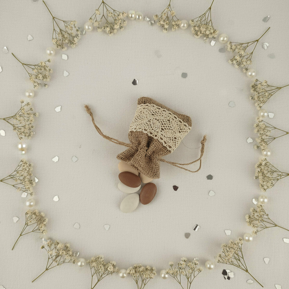 Avec sa combinaison de jute naturelle et de dentelle délicate, ce sac apporte une touche bohème chic à vos tables. Contrairement aux pochons classiques, il se distingue par son côté romantique et raffiné, qui attire le regard et s’accorde à merveille avec des dragées blanches, pastel ou même colorées. Sa texture chaleureuse et ses détails en dentelle créent un rendu harmonieux qui embellira vos compositions de table.