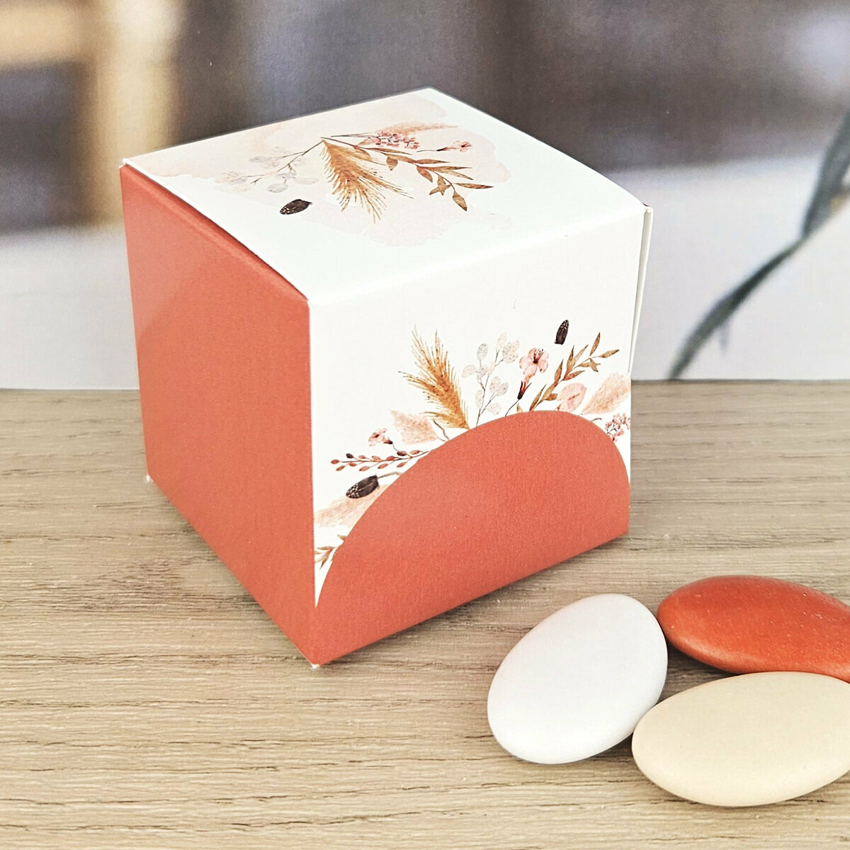Description : Boite à dragées cube ''Bohème terracotta'' personnalisée