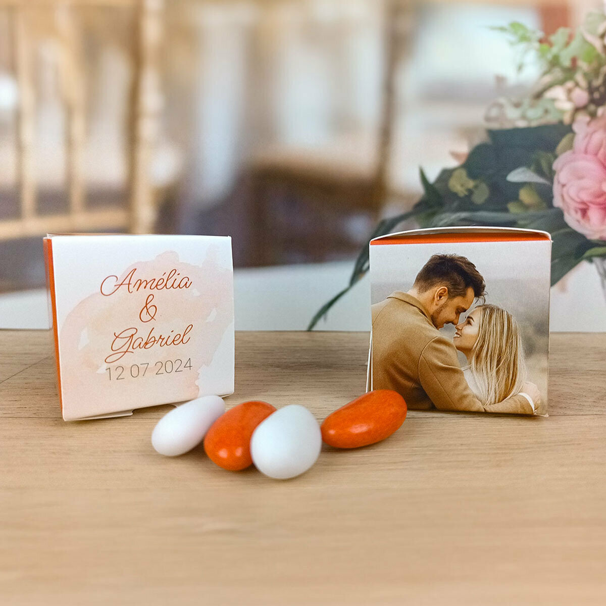La boîte à dragées cube Bohème Terracotta est entièrement personnalisable : ajoutez votre photo, un prénom, une date spéciale ou un petit mot doux pour créer une pièce unique.