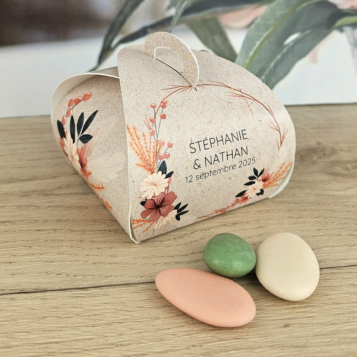 Imaginée par notre équipe de graphistes et fabriquée dans notre atelier artisanal à La Roche-sur-Yon (Vendée) 🇫🇷, la boîte à dragées Tulipe – thème Fleurs séchées est le fruit d’un travail passionné.