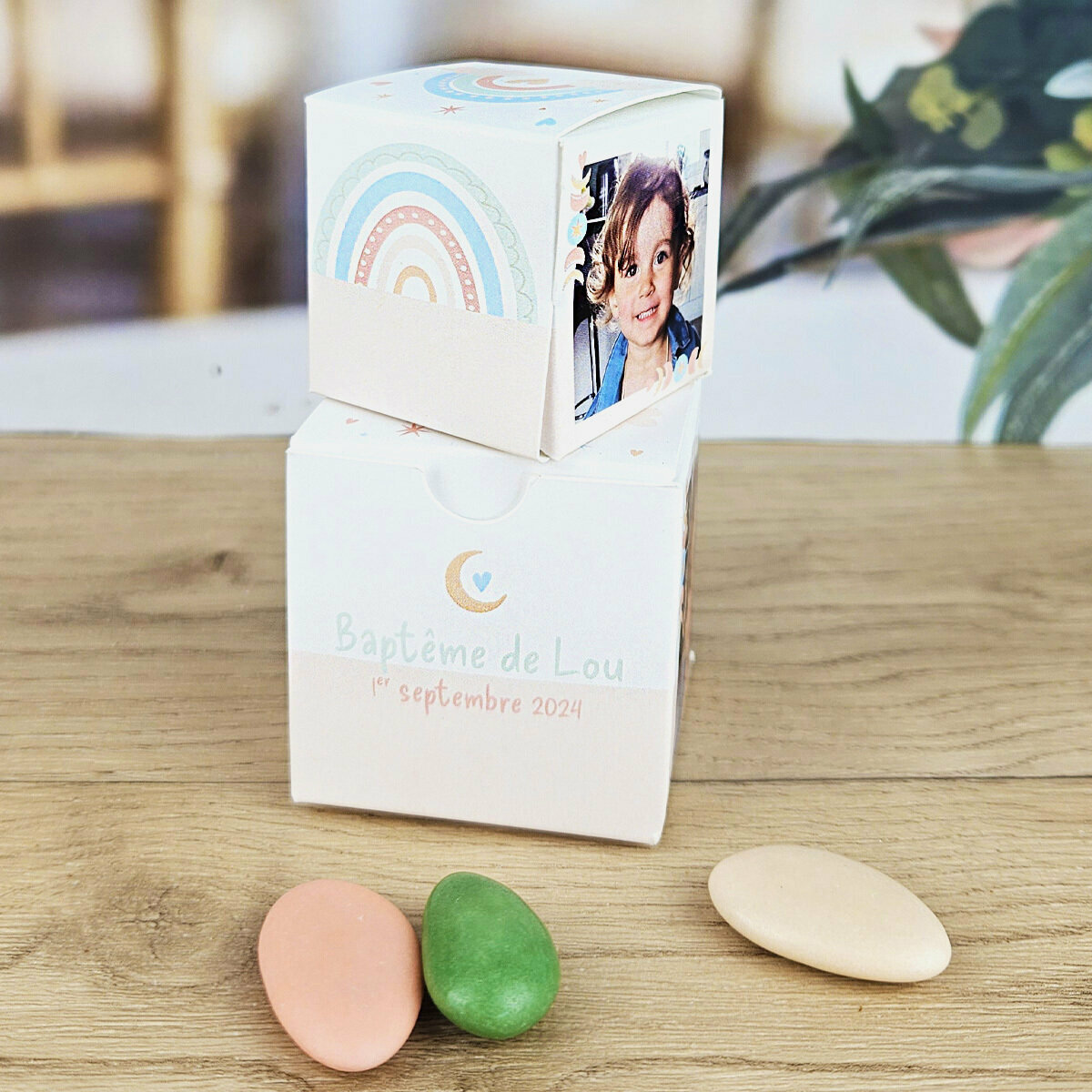 La boîte à dragées cube Arc-en-ciel est entièrement personnalisable : ajoutez votre photo, vos prénoms, une date importante ou un joli message pour transformer ce petit écrin en souvenir inoubliable.
