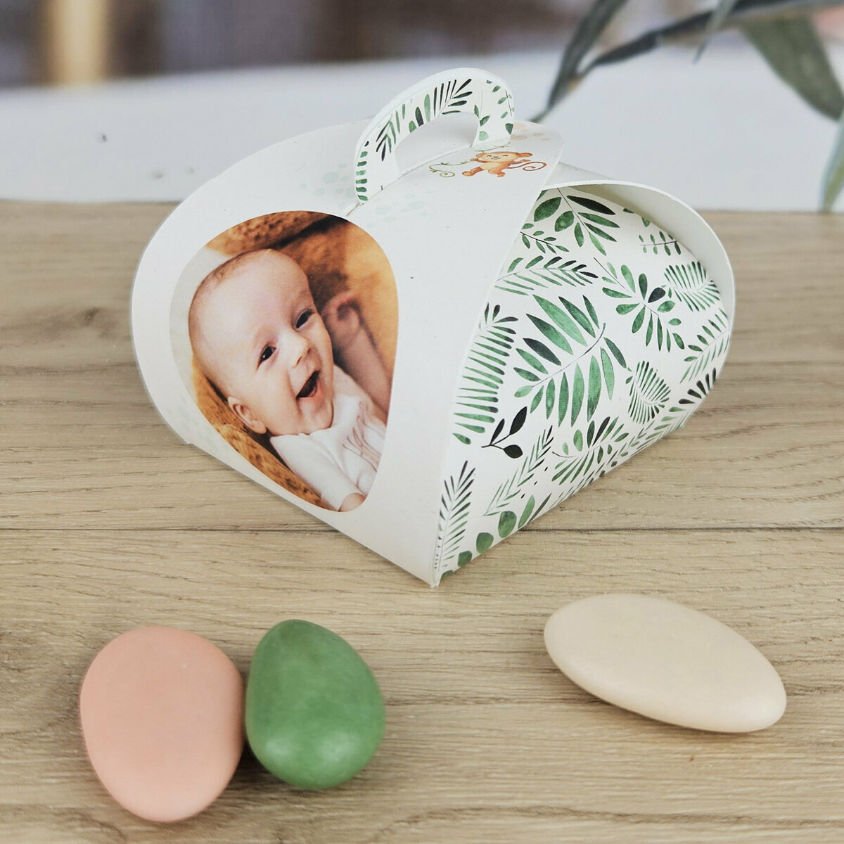 Découvrez notre boîte à dragées Tulipe – thème Jungle, un écrin délicat et ludique, parfait pour vos baptêmes, naissances ou baby showers.