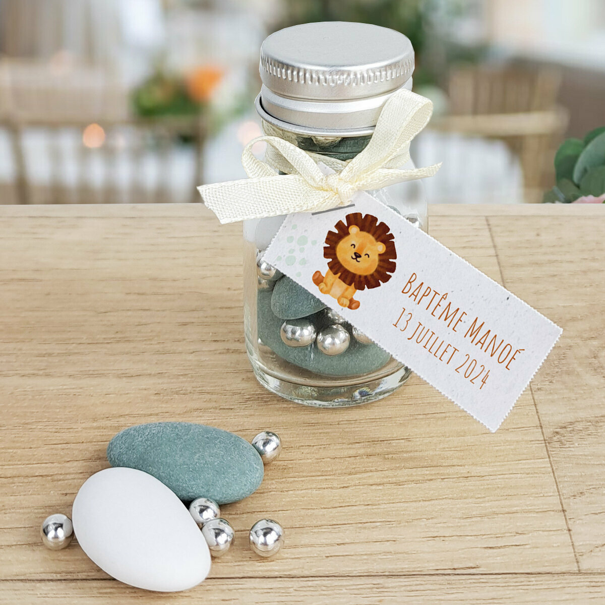 Apportez une touche exotique et pleine de tendresse à vos événements avec notre étiquette cartonnée – thème Jungle 🌿. Personnalisez-la avec votre texte pour créer un souvenir unique et original, idéal pour les baptêmes, naissances ou baby showers. Ornée de jolis lions et de feuillages tropicaux, elle apportera une note joyeuse et naturelle à vos boîtes à dragées, cadeaux d’invités ou décorations de table.
