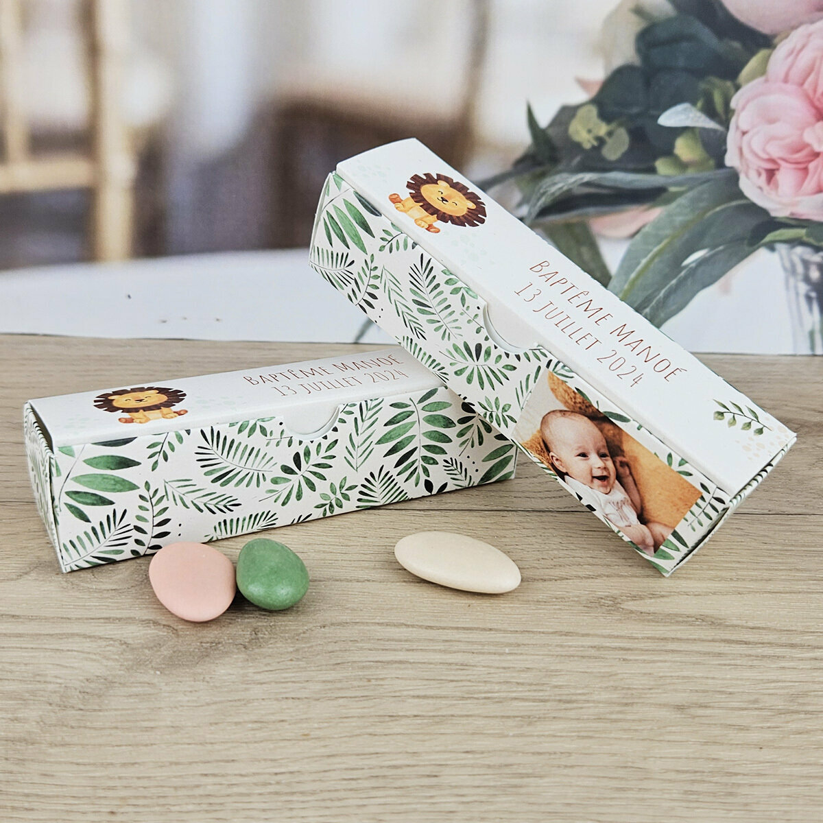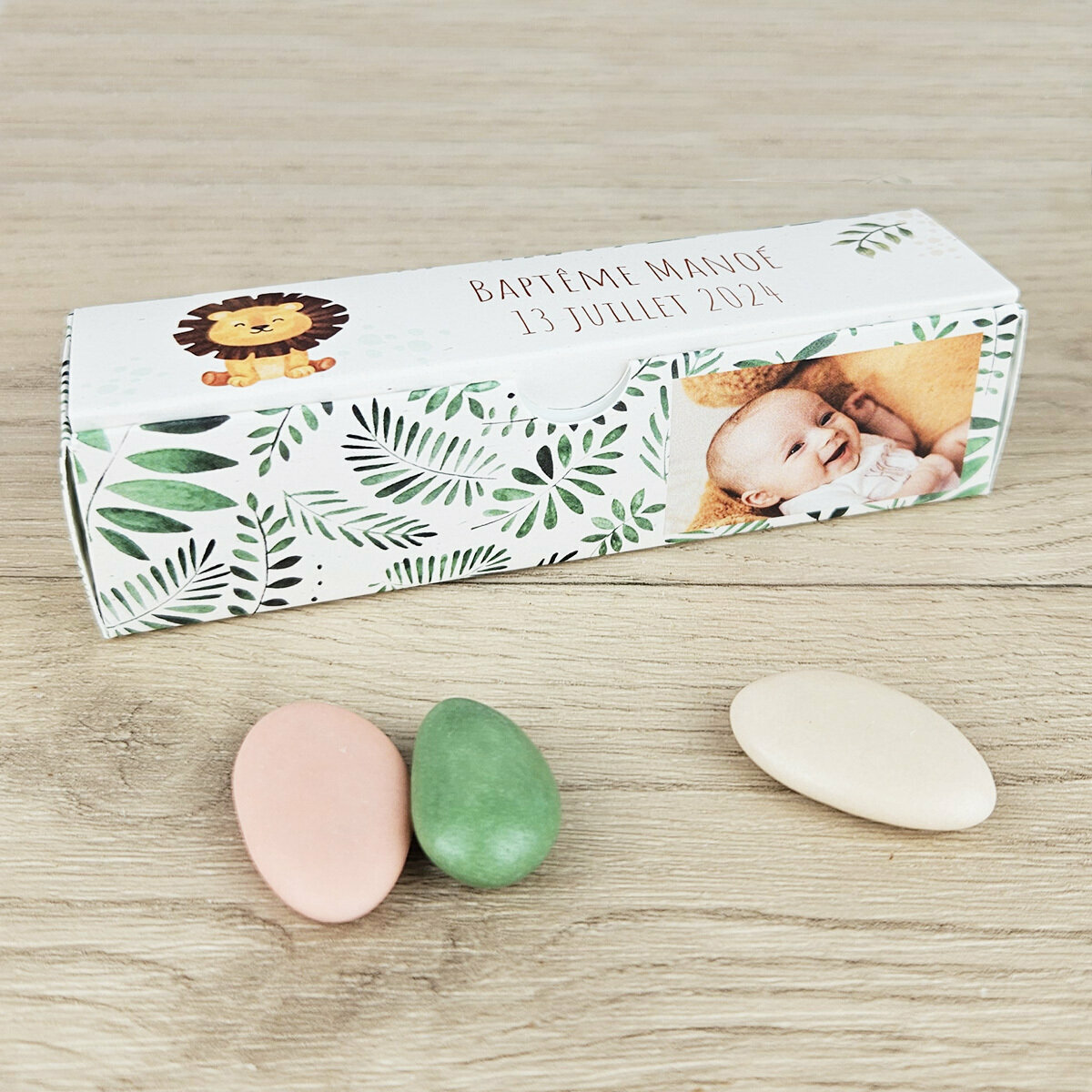 Laissez-vous séduire par notre boîte à dragées Étui – thème Jungle, une création à la fois douce et pleine d’aventure, parfaite pour célébrer les baptêmes, naissances ou baby showers. Ce modèle unique transporte vos invités dans une ambiance tropicale, peuplée de petits lions malicieux et de feuillages exotiques, pour un souvenir à la fois attendrissant et original.
