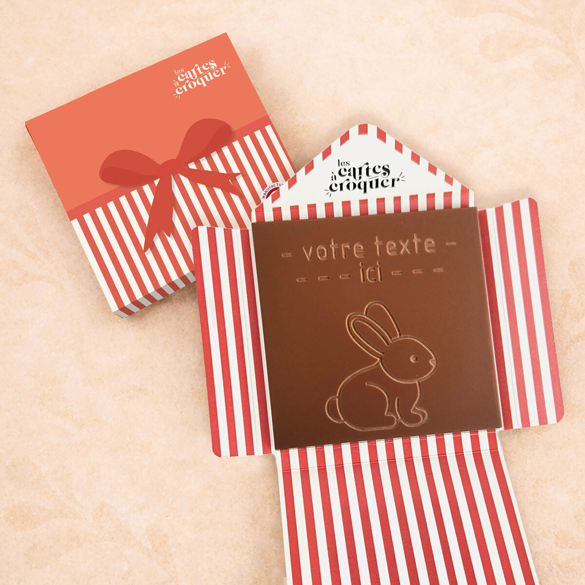 La Carte à Croquer – Modèle Mon Lapin célèbre Pâques avec gourmandise et tendresse. Gravure d’un lapin et de votre message sur 2 lignes de 15 caractères dans du chocolat noir, lait ou lait-caramel. Artisanale et personnalisable, elle offre un cadeau festif, original et délicieux pour petits et grands.