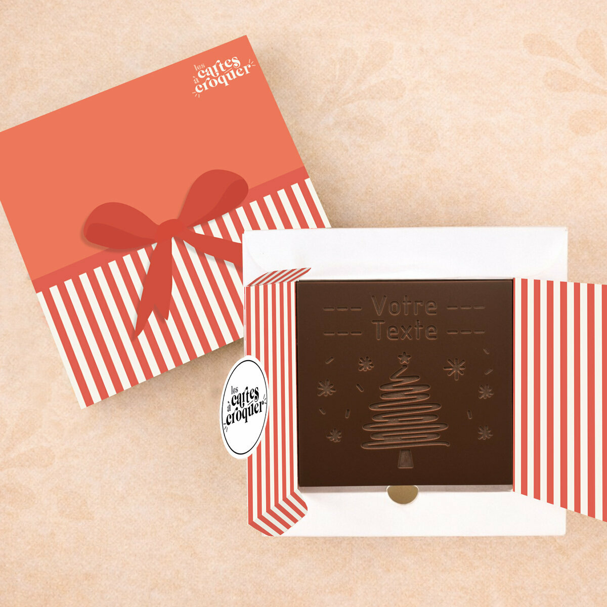Au-delà de son apparence, la Carte à Croquer offre une expérience sensorielle complète. Le chocolat fond délicatement en bouche, libérant des arômes subtils et raffinés. La gravure du sapin et de votre message personnalisé ajoute une dimension émotionnelle et festive. Chaque bouchée devient un moment de plaisir et de complicité, transformant un simple geste en un souvenir gourmand et chaleureux. La combinaison entre goût, esthétique et personnalisation rend cette carte exceptionnelle pour célébrer Noël et le Nouvel An.