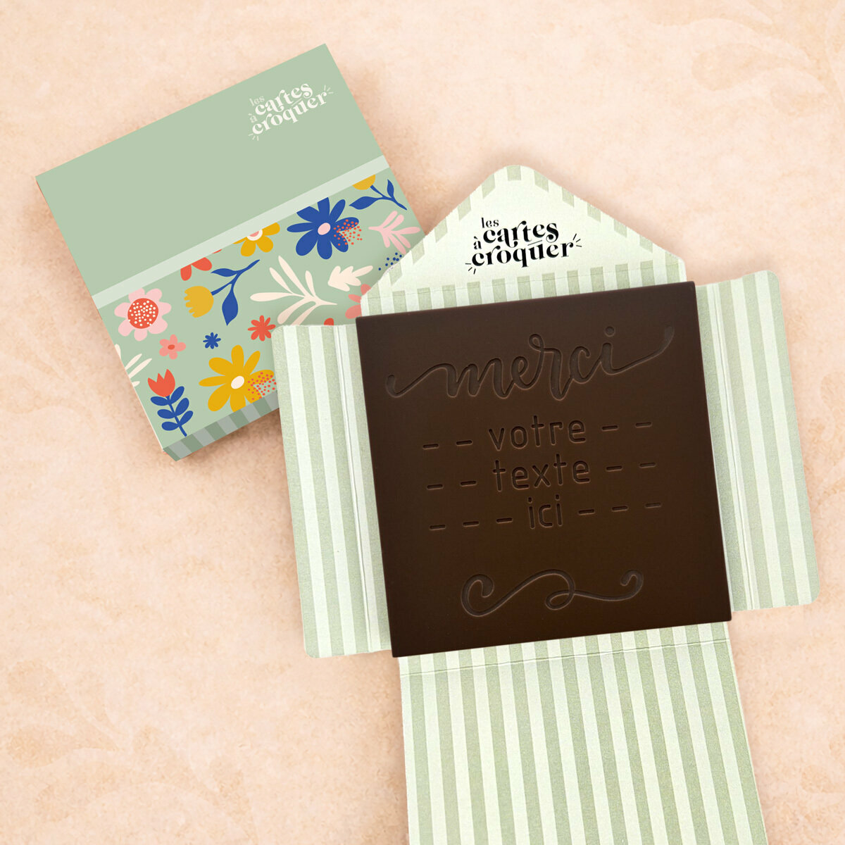 Chaque Carte à Croquer – Modèle Merci Arabesque est fabriquée artisanalement, avec une attention particulière apportée aux détails. Les chocolatiers sélectionnent des ingrédients de haute qualité pour créer un chocolat fondant et aromatique. Le mot « Merci », les arabesques décoratives et votre message personnalisé sont soigneusement gravés, donnant un résultat élégant et raffiné. Offrir cette carte, c’est partager un chocolat d’exception qui ravira autant les yeux que les papilles et valoriser le savoir-faire artisanal français.