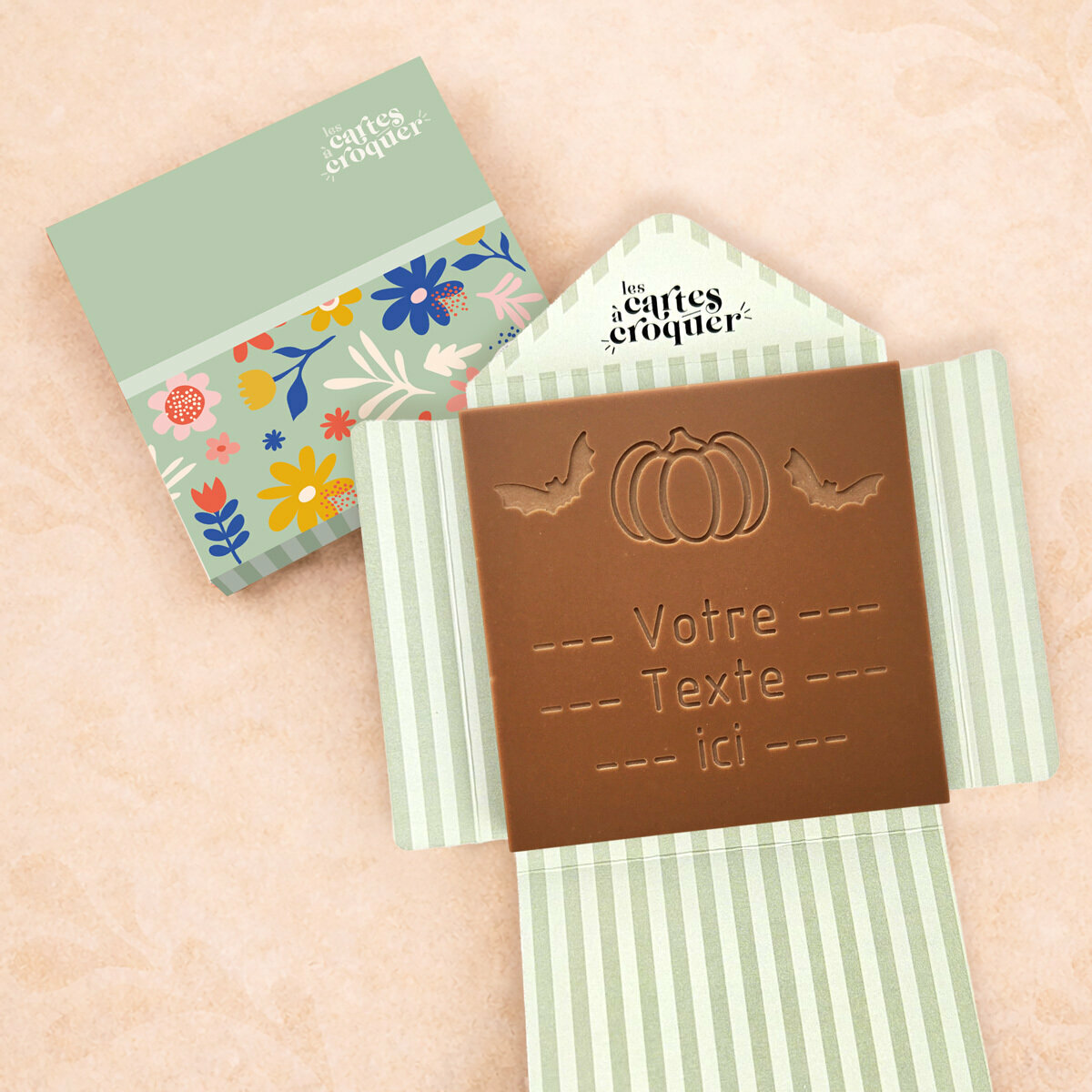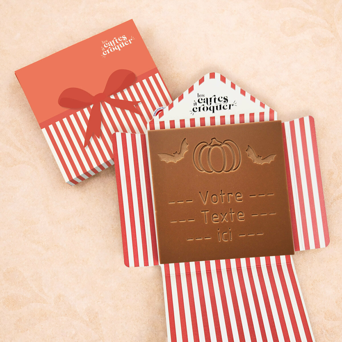 La Carte à Croquer – Modèle Citrouille d’Halloween est une gourmandise personnalisable en chocolat noir, lait ou lait-caramel. Avec ses 3 lignes de 15 caractères, ajoutez votre message dans cette création artisanale décorée d’une citrouille et de chauves-souris, parfaite pour sublimer votre table d’Halloween.